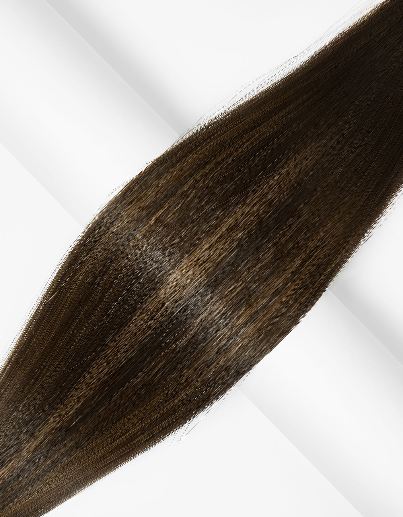 Our Coco Melt shade is a rich, dark yet soft brunette that beautifully blends warmth and depth. This multi-tonal dimensional balayage shade features a deep base sitting between levels 4 and 5, seamlessly blending into a level 7 with toffee & caramel hues through the mid-lengths and ends. With it's warm golden caramel undertones, Coco Melt adds softness to darker hair without being overly bright.